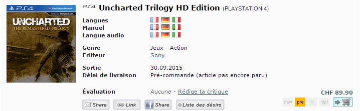 Secondo il rivenditore svizzero “CeDe”, su PlayStation 4 sarebbe in arrivo la “Uncharted: The Remastered Trilogy”, ovvero i primi tre capitoli riproposti in alta definizione sulla console next-gen di Sony. L’uscita del gioco è prevista per il 30 settembre 2015, ma dando uno sguardo alla cover della Collection, sembrerebbe che sia stata creata da terze parti, quindi un falso. Ovviamente attendiamo conferme o smentite da parte di Naughty Dog, impegnata al momento nello sviluppo di Uncharted 4: A Thief’s End.