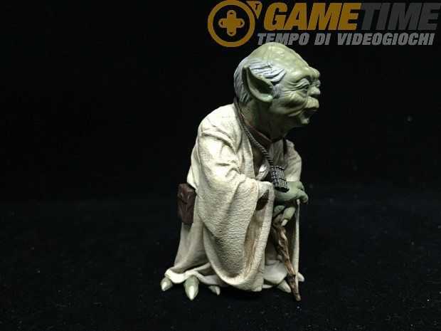 Passiamo a Yoda. La figure anche lei, realizzata nella medesima scala e materiali. All’interno della confezione troviamo il corpo, due braccia sinistre con pose diverse, una collana e due teste. L’assemblaggio è molto semplice , grazie agli incastri, e possiamo decidere in che modalità esporlo se con entrambe le braccia che poggiano sul bastone , oppure con la mano destra in avanti. Stesso discorso vale per le teste, una con occhi chiusi e una con occhi aperti.