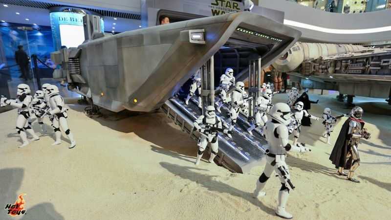 Il Millennium Falcon è il lungo circa 5 m e mezzo ed era stato esibito per la prima volta nel mese di luglio a Hong Kong; ma nelle foto che vi riportiamo qui sotto è accompagnato da uno squadrone di Stormtrooper, ognuno dei cui membri è alto più o meno 30 cm.
