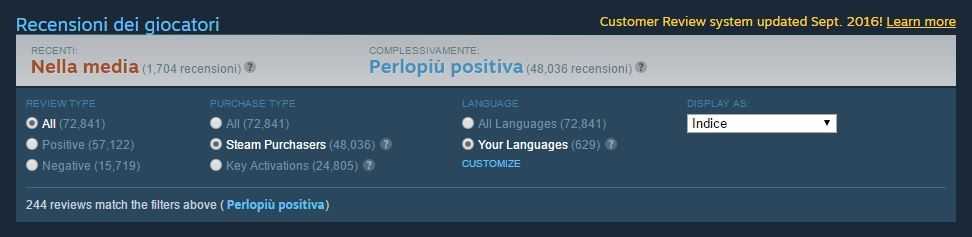 Con le novità introdotte ci saranno tre nuovi filtri per le recensioni che potete vedere qui sotto. È possibile filtrare le recensioni positive da quelle negative, come quelle scritte da chi ha acquistato il negozio dallo store rispetto a chi ha riscattato una key. È anche possibile filtrare le recensioni in base alla lingua per aiutare coloro che non masticano lingue straniere.