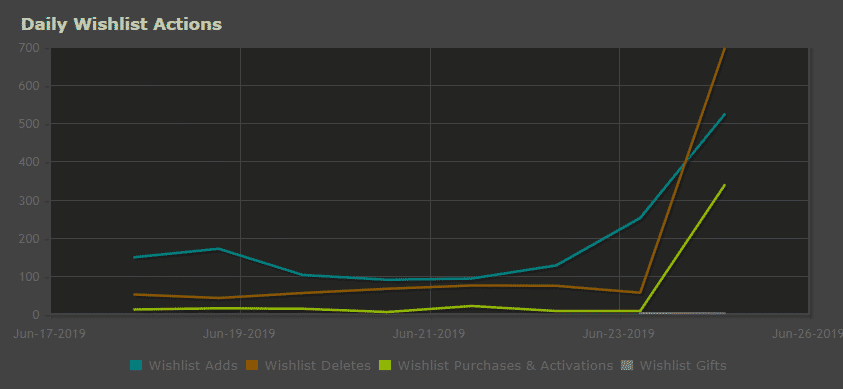 Hey @GreyAlien – Are your games seeing an abnormally high amount of wishlist deletions? I and 4 other devs all are seeing some pretty strange stats. I've never once in 5 years seen more deletes than adds/P&A during a seasonal sale. I've always left a sale with a net increase. pic.twitter.com/v1OY4MUQW5