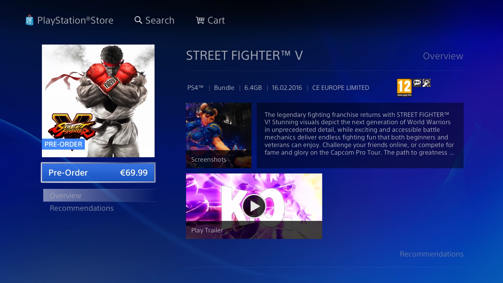 Secondo quando è stato rivelato dallo stesso PlayStation Store, il quinto capitolo del picchiaduro di Capcom occuperà solamente 6,4 GB sul disco rigido delle vostre console. Si tratta in fin dei conti di uno spazio decisamente contenuto che però sarà molto probabilmente ben sfruttato, almeno a giudicare dai tanti video di gameplay e di presentazione che sono giunti fino a oggi.
