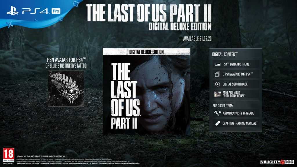 Infine per chi è poco “materialista” e non sente il bisogno di stringere tra le mani qualcosa di fisico, ecco la Digital Deluxe Edition. Qui oltre al gioco (sempre in formato digital) troverete tutti i contenuti digitali dell’edizione Collector’s e quindi Tema Dinamico, 6 avatar PSN più un avatar esclusivo con il tatuaggio di Ellie, soundtrack digitale, mini art book digitale ed eventuali bonus preorder.