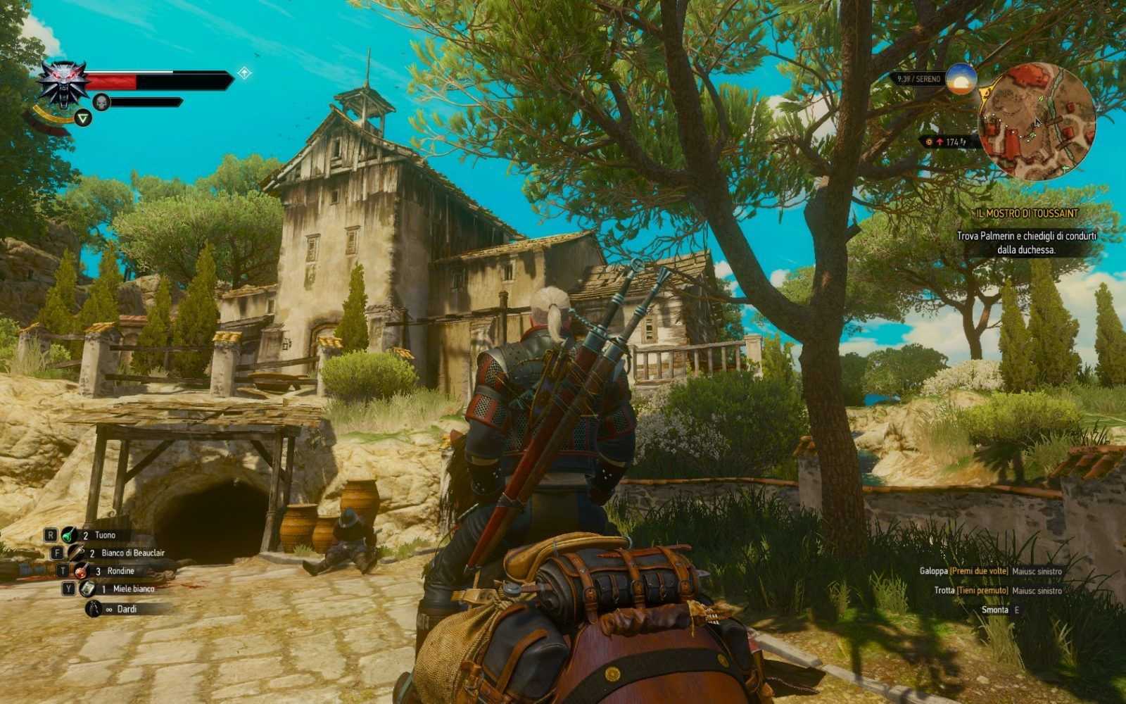 Per meglio farci calare nei panni del witcher accorre in nostro aiuto un azzeccato accenno a quello che potremmo definire un sistema di housing. Quasi da subito ci viene data la possibilità di risiedere in una nostra personale dimora, Corvo Bianco, un casale semidistrutto che potremo riportare al suo antico splendore investendo denaro e abbellendolo con i dipinti, le armature e le armi che abbiamo raccolto in passato o che incontreremo durante il nostro nuovo peregrinare. Una stalla per Rutilia, una serra per le nostre erbe, un laboratorio alchemico e un caldo focolare tenteranno di imbrigliare il vagabondo in questo incantevole luogo, circondato da vigneti e uliveti che sembrano essere stati strappati da una qualche zona mediterranea, francese forse, o addirittura italiana, come a qualcuno piace pensare. Toussaint si rivela un territorio decisamente vasto, che ci terrà impegnati per svariate ore prima di poter essere davvero soddisfatti.