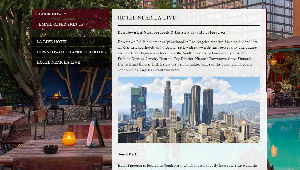 L’Hotel Figueroa di Los Angeles pare abbia preso un abbaglio, pubblicando sul suo sito web un’immagine della città immaginaria di GTA 5, Los Santos, invece di una foto del centro della città californiana.