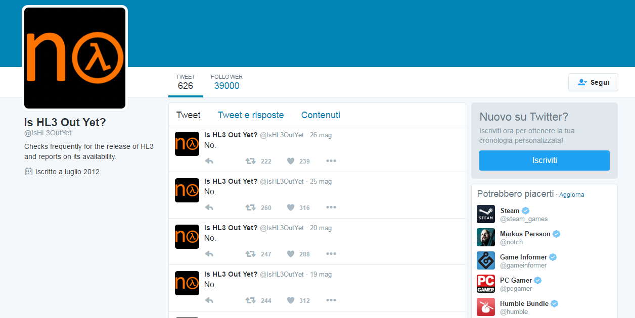 Un fan di Half-Life ha creato un profilo Twitter chiamandolo “Is HL3 Out Yet?” letteralmente “È uscito Half-Life 3?”. Il profilo è attivo dal 2012 e continua a pubblicare in maniera costante, giorno per giorno, dei tweet contenenti la parola “No”, quasi come in un botta e risposta con se stesso.