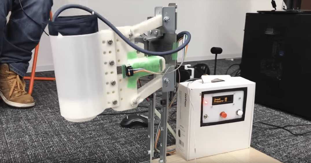Al suo interno il bracciolo di uno sfigmomanometro e un sex toy simulano l’apparato riproduttivo, con la possibilità di variarne la pressione esercitata.