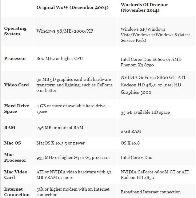 Ecco le differenze tra i requisiti PC e Mac richiesti nel 2004 e quelli richiesti per poter utilizzare Warlords of Draenor. Notate qualche differenza?