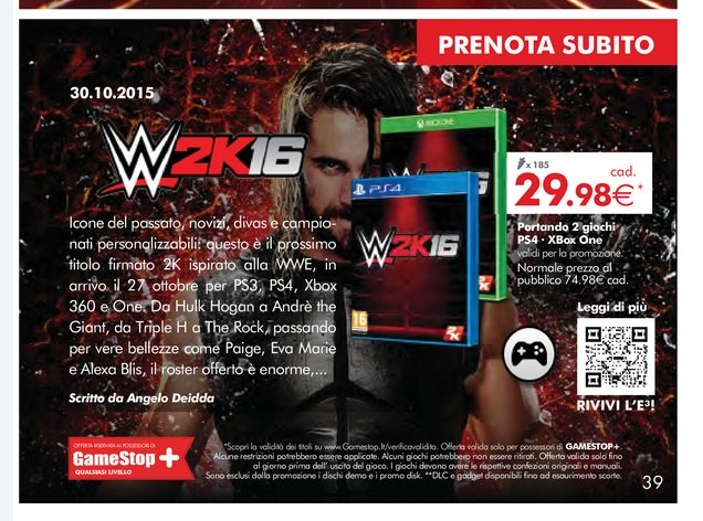 WWE 2K16 sarà disponibile in Europa il 30 ottobre 2015 su PlayStation 4, PlayStation 3, Xbox One e Xbox 360.